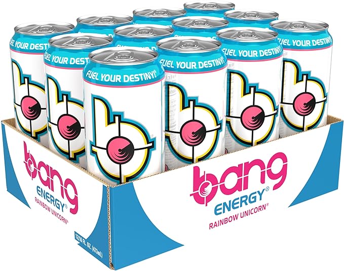 Bang Rainbow Unicorn Energy Drink is a Bang Energy Drink. This Bang is not your typical sugar filled soda masquerading as an energy drink. Every 16 ounce can of Bang contains 300 milligrams of caffeine, which studies have shown may increase endurance as well as strength in some cases, along with essential amino acids, CoQ10 and super Creatine. This Bang Energy Drink delivers a safe, sugar free, carb free, crash free, great tasting, and sustained energy beverage experience. The Caffeine in this Bang Rainbow Unicorn Energy Drink increases mental focus, alertness, endurance and possibly even strength. It has zero carbohydrates which help you to avert the blood sugar spikes and avoid empty calories as well. It is the only form of Creatine that is sustainable in liquid for an extended period.